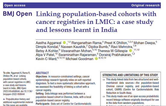 Project 1 | Development of a NCD cohort-cancer linkage in the CARRS cohort: Aim was to compare CARRS participants’ information on incident cancer in the Chennai cancer registry and compare these linkages to self-reports and verbal autopsy-classified cancer deaths of CARRS cohort in Chennai, Tamil Nadu. Utilizing linking variables with limited discriminatory power, an appreciable proportion of self-reported cases were confirmed in the registry via linkages. The linkages also identified many previously unreported cases. The project resulted in insights that can inform future cancer surveillance and research.