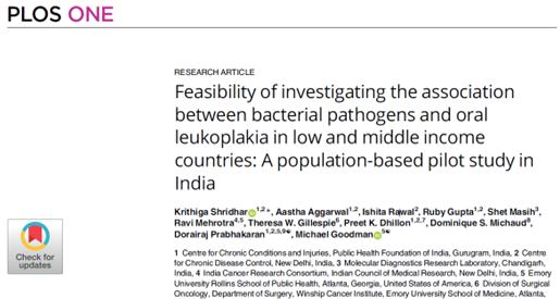 Project 3 | Establishing the feasibility of investigating microbiome in population-based studies– There is evidence for the association of microbiome with oral cancer and diabetes. A feasibility study was conducted in the Delhi site of CARRS study to investigate the association between selected bacterial pathogens and oral leukoplakia. The feasibility of evaluating oral microbiome in population studies was established and promising leads for future research were identified.